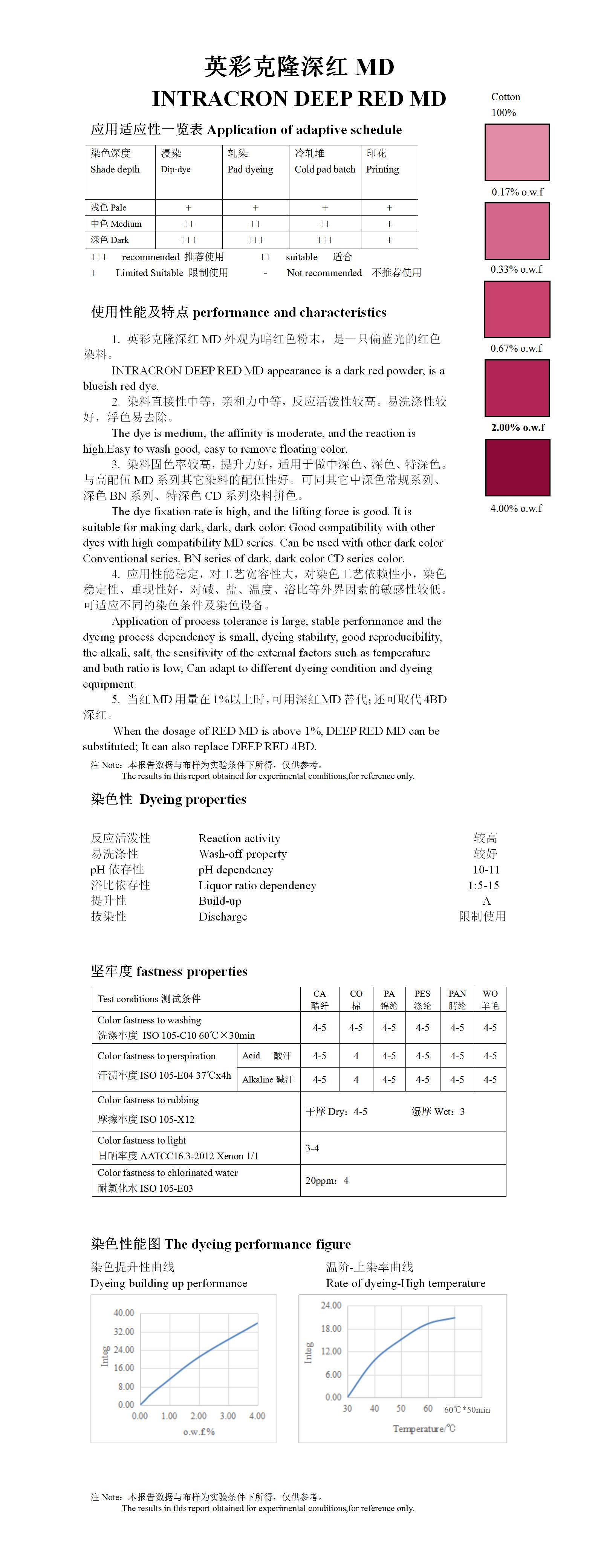 可提供浅色、中深色、特深色系列优良的色牢度,与同等深度的常规染料相比,具有更好的色牢度及更经济的成本优势,适用于多种工艺,如浸染和连续染色。 The range offers, very dark shades and offer better colorfastness and more economical than conventional dyes for the same depths. It's applicable to various processes like exhaust dyeing and continuous dyeing.