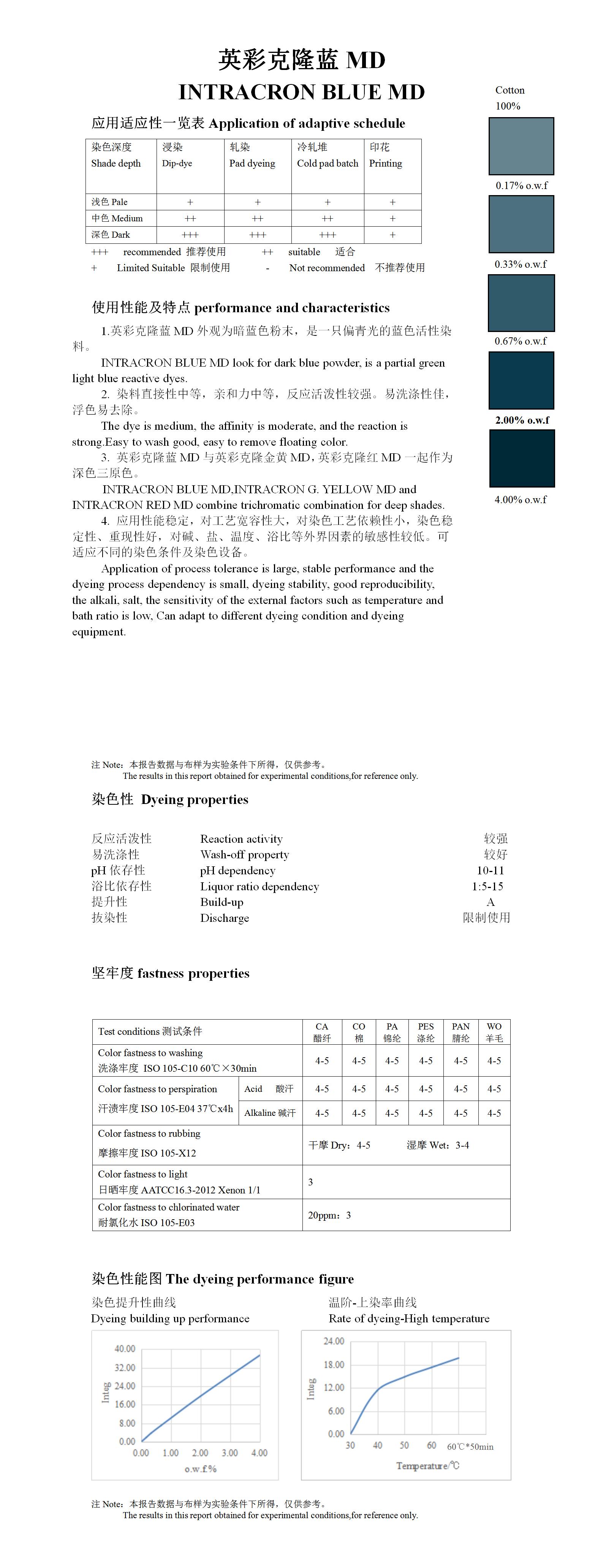 可提供浅色、中深色、特深色系列优良的色牢度,与同等深度的常规染料相比,具有更好的色牢度及更经济的成本优势,适用于多种工艺,如浸染和连续染色。