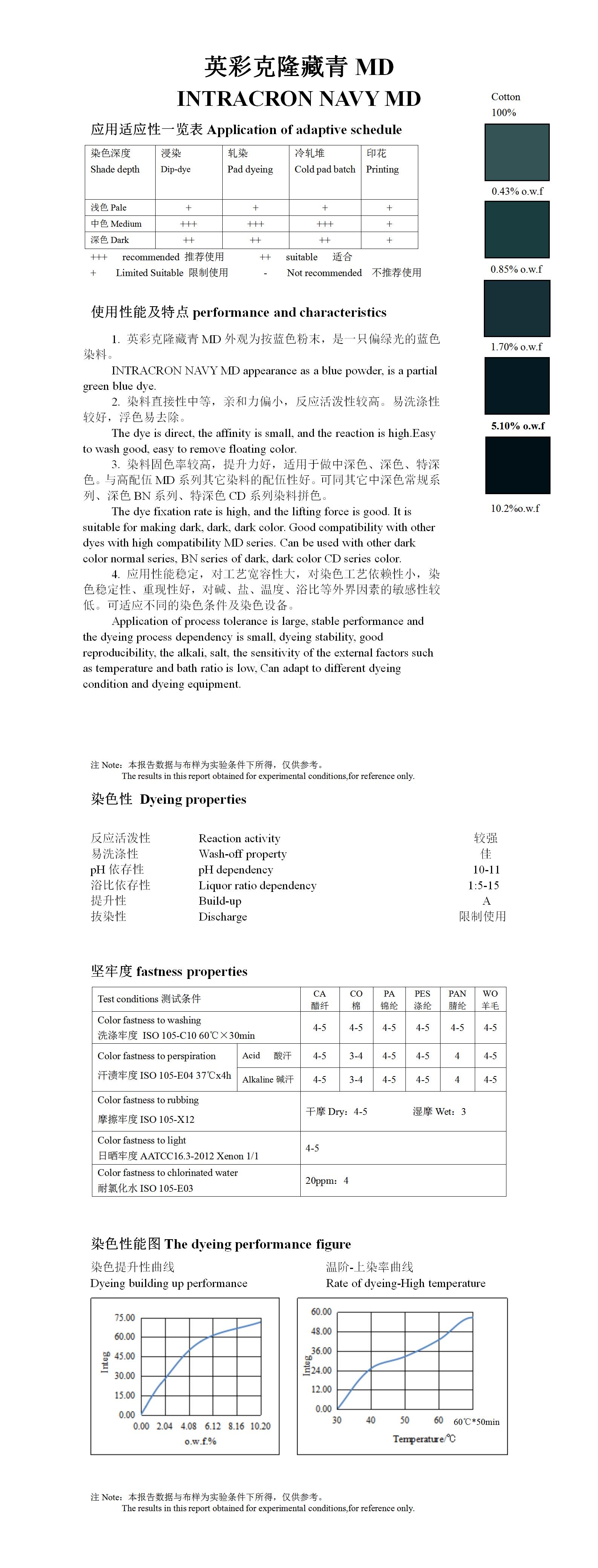 可提供浅色、中深色、特深色系列优良的色牢度,与同等深度的常规染料相比,具有更好的色牢度及更经济的成本优势,适用于多种工艺,如浸染和连续染色。