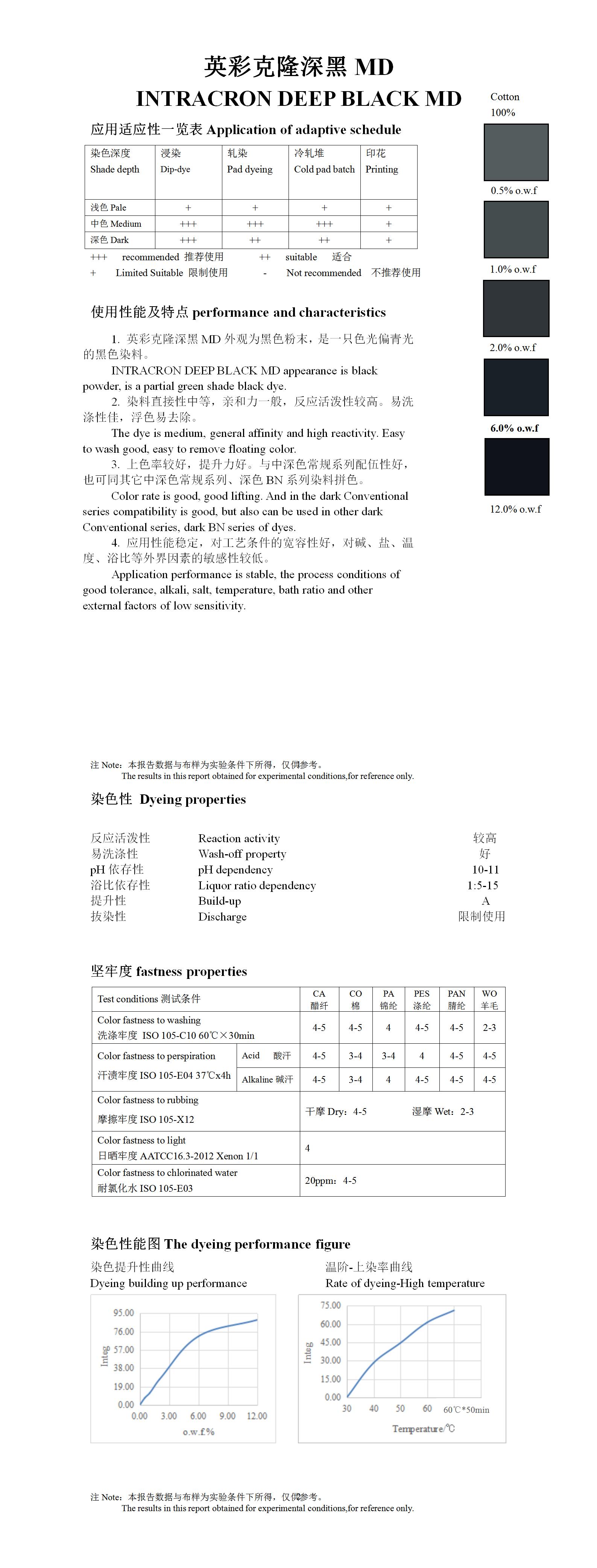 可提供浅色、中深色、特深色系列优良的色牢度,与同等深度的常规染料相比,具有更好的色牢度及更经济的成本优势,适用于多种工艺,如浸染和连续染色。