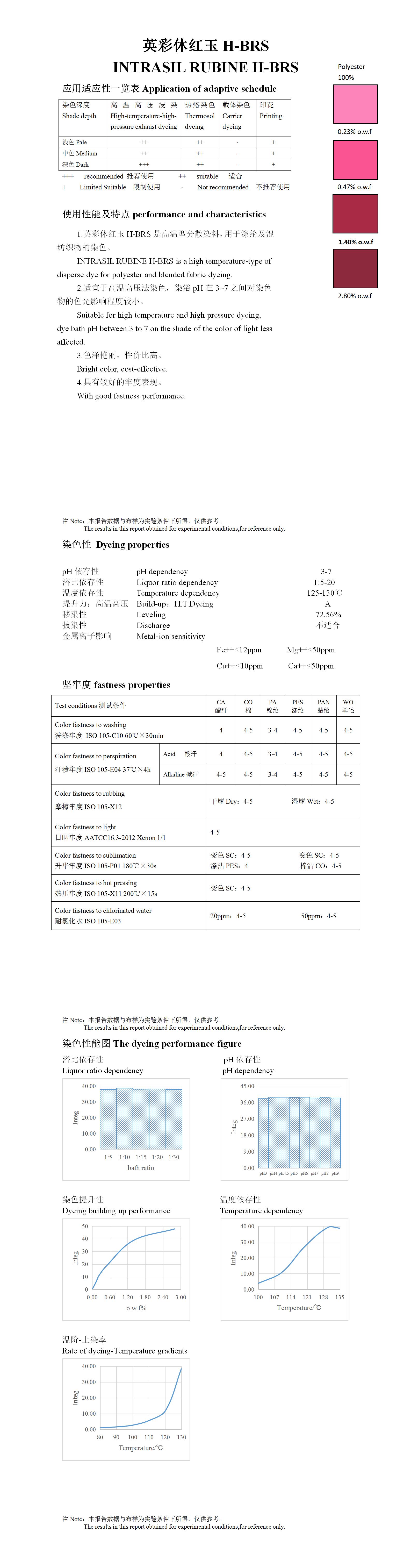 英彩休红玉H-BRS是高温型分散染料,用于涤纶及混纺织物的染色,具有较好的牢度表现。
