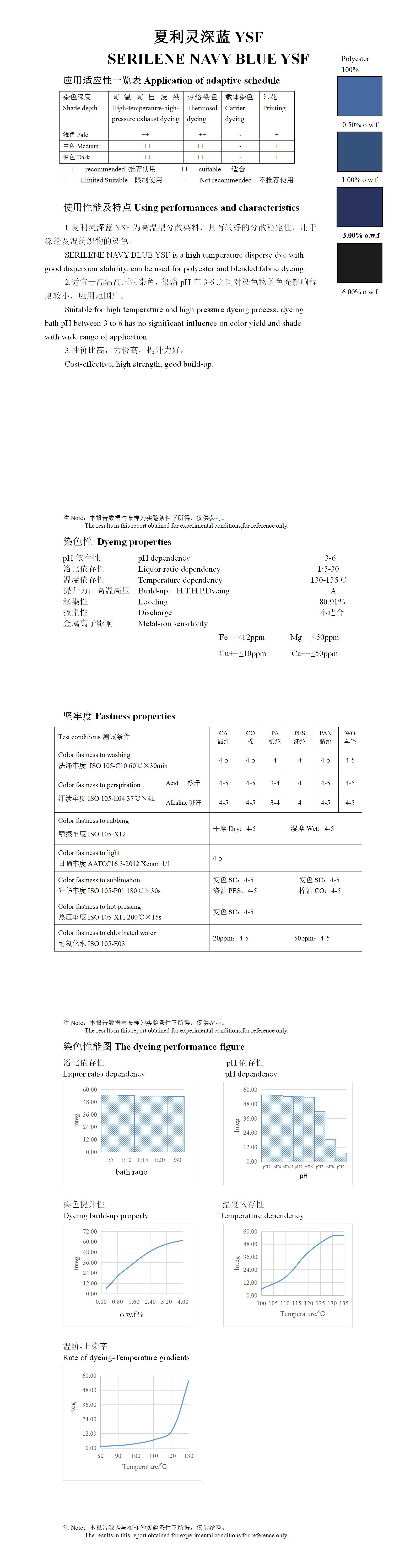 SERILENE NAVY BLUE YSF is a high temperature disperse dye with good dispersion stability, can be used for polyester and blended fabric dyeing.