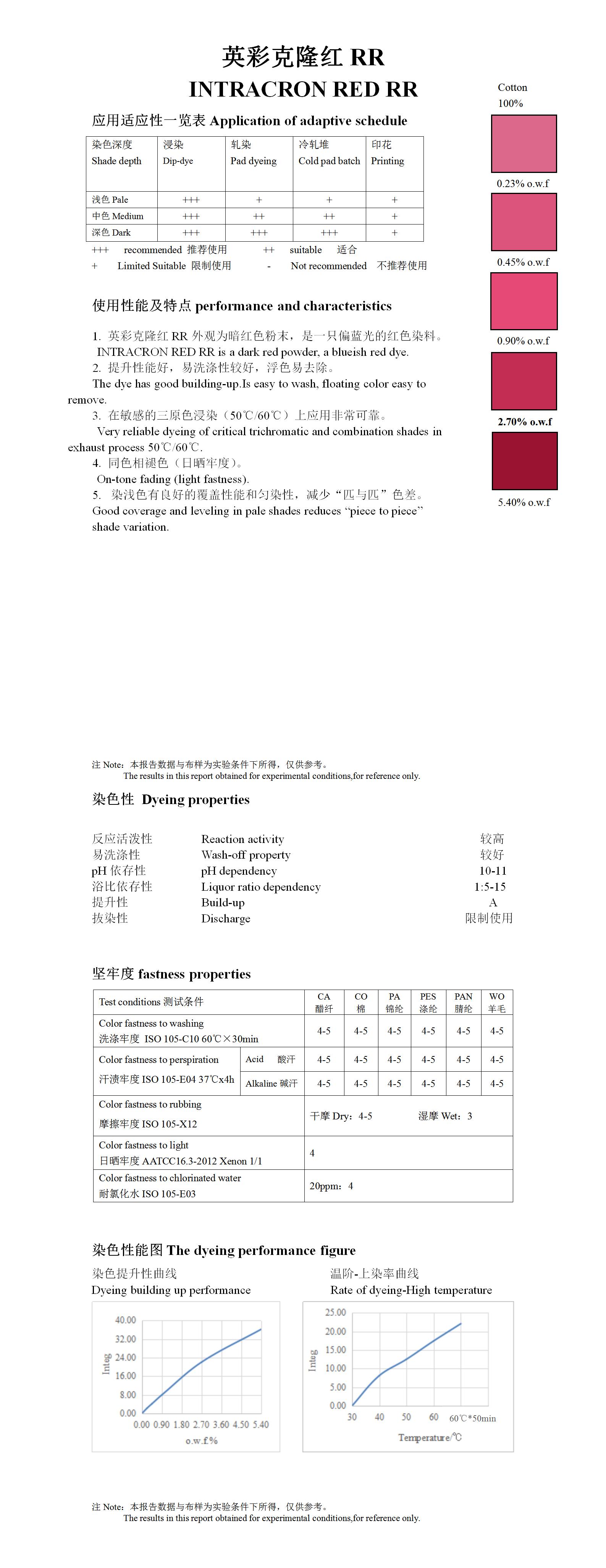 在敏感的三原色浸染(50℃/60℃)上应用非常可靠。染浅色有良好的覆盖性能和匀染性,减少“匹与匹”色差。