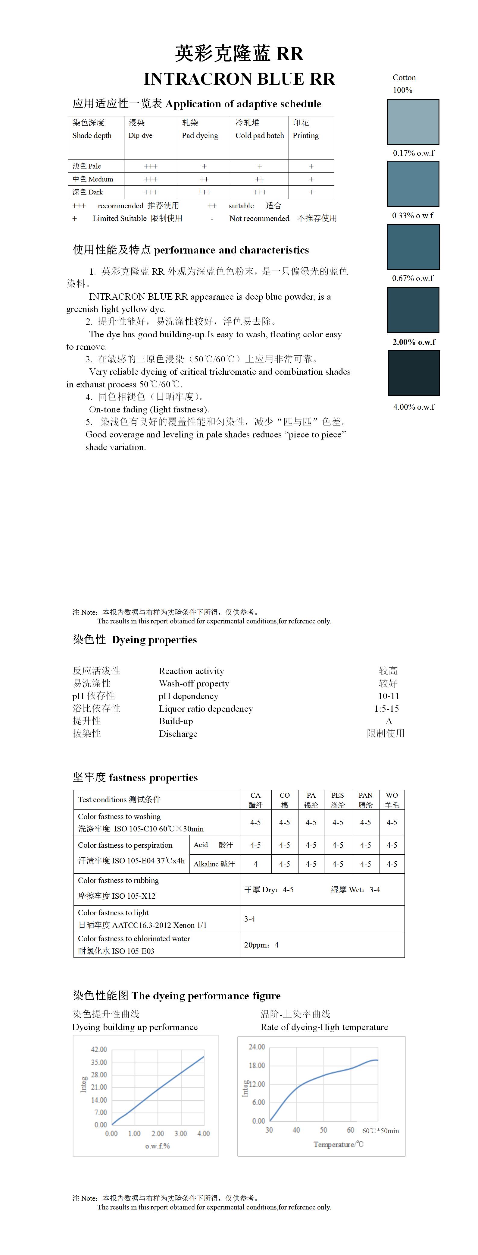 在敏感的三原色浸染(50℃/60℃)上应用非常可靠。染浅色有良好的覆盖性能和匀染性,减少“匹与匹”色差。 Very reliable dyeing of critical trichromatic and combination shades in exhaust process 50℃/ 60℃. Good coverage and leveling in pale shades reduces “piece to piece” shade variation.