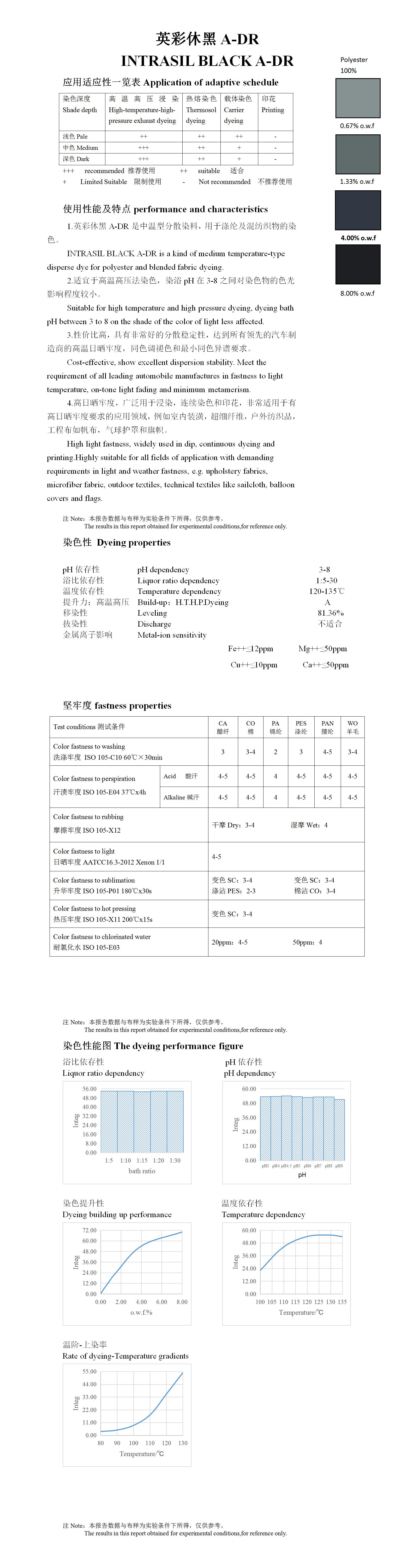 高日晒牢度,广泛用于浸染,连续染色和印花,非常适用于有高日晒牢度要求的应用领域,例如室内装潢,超细纤维,户外纺织品,工程布如帆布,气球护罩和旗帜。