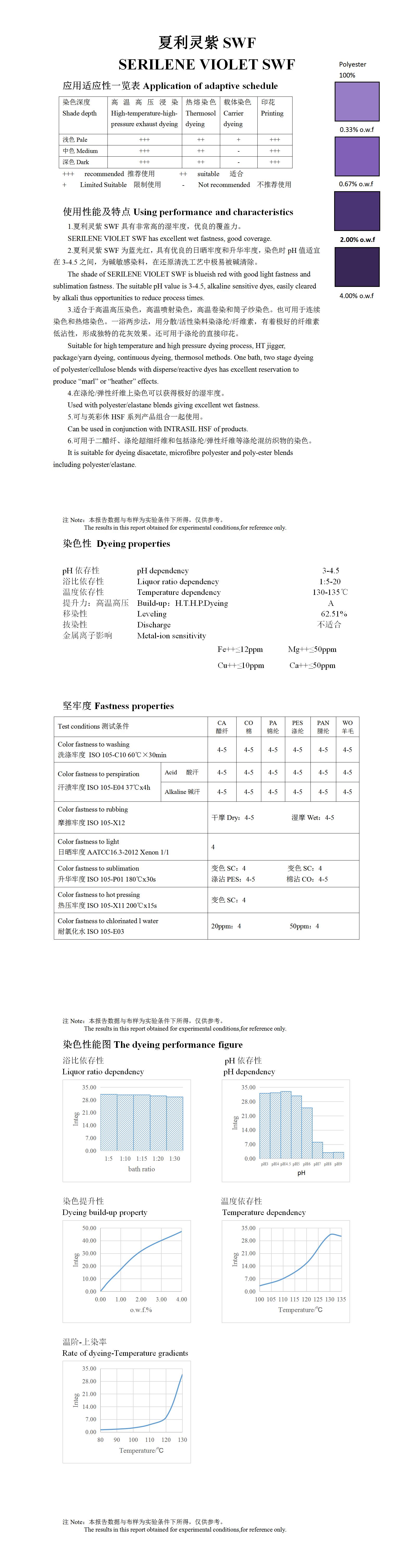 在涤纶/弹性纤维上染色可以获得极好的湿牢度。