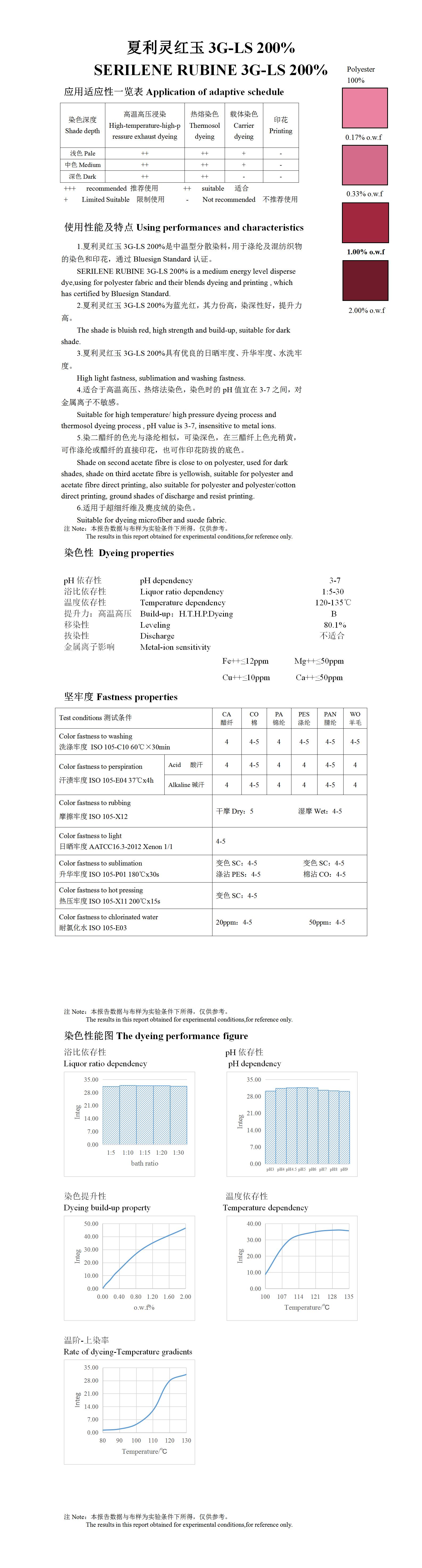 SERILENE RUBINE 3G-LS 200% is a medium energy level disperse dye,using for polyester fabric and their blends dyeing and printing , which has certified by Bluesign Standard.