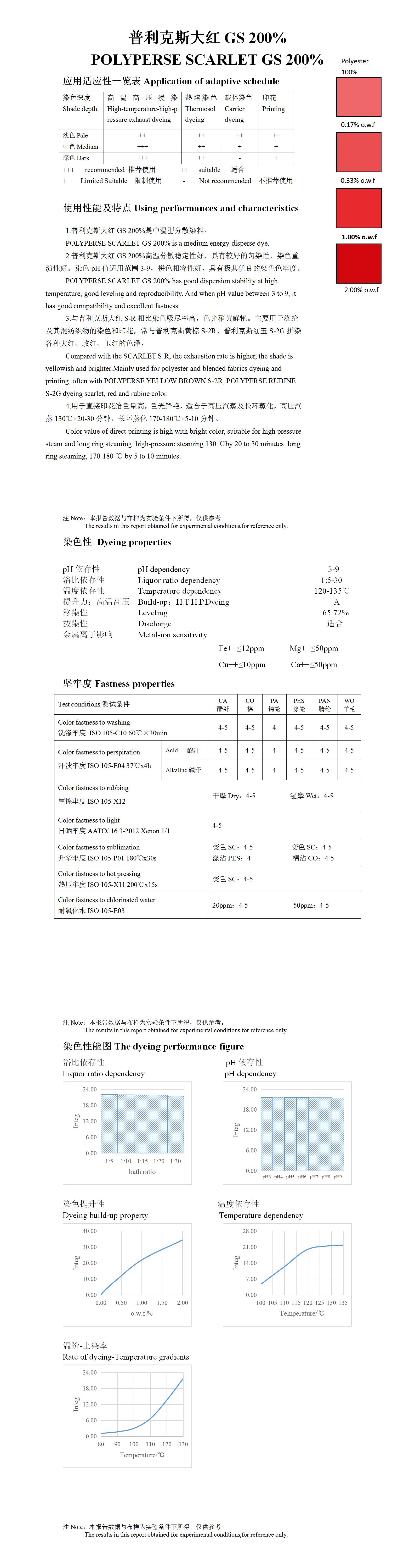 POLYPERSE SCARLET GS 200% has good dispersion stability at high temperature, good leveling and reproducibility. And when pH value between 3 to 9, it has good compatibility and excellent fastness.