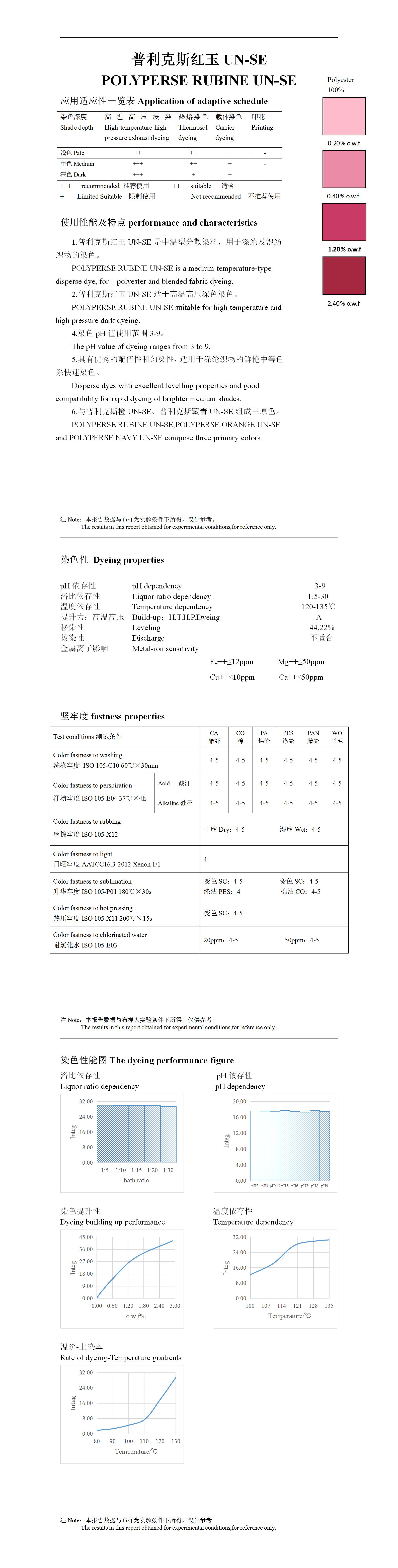 POLYPERSE RUBINE UN-SE is a medium temperature-type disperse dye, for polyester and blended fabric dyeing.