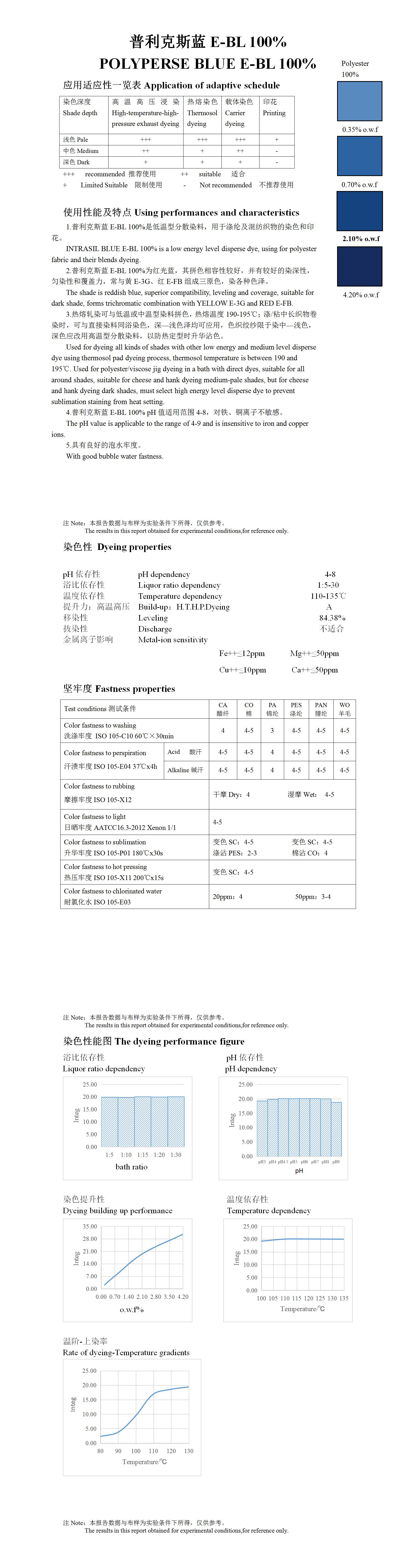 普利克斯蓝E-BL 100%是低温型分散染料,用于涤纶及混纺织物的染色和印花。