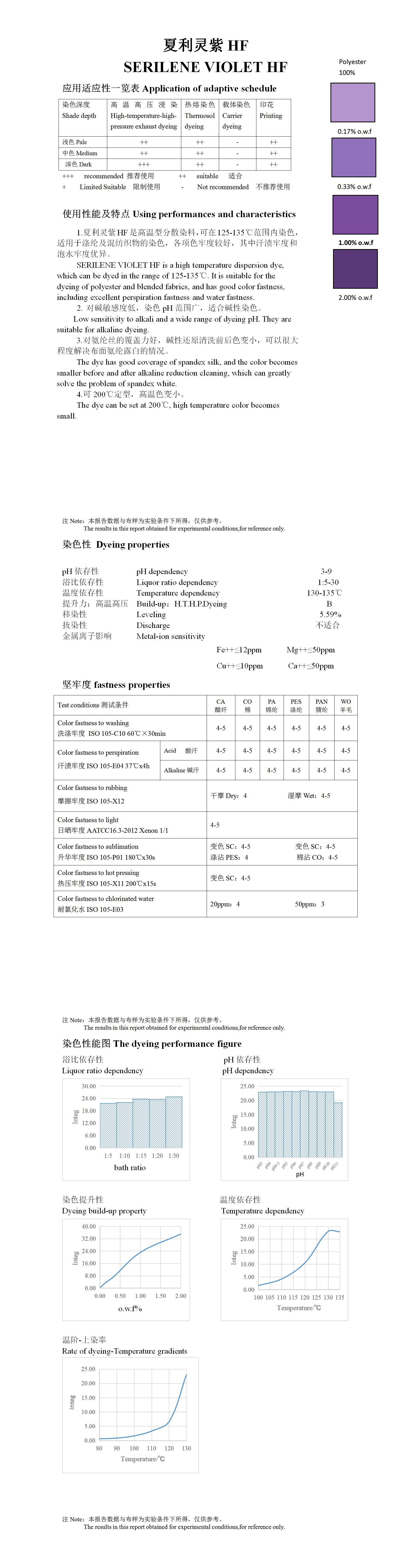 SERILENE VIOLETHF is a high temperature dispersion dye, which can be dyed in the range of 125-135℃. It is suitable for the dyeing of polyester and blended fabrics, and has good color fastness, including excellent perspiration fastness and water fastness.